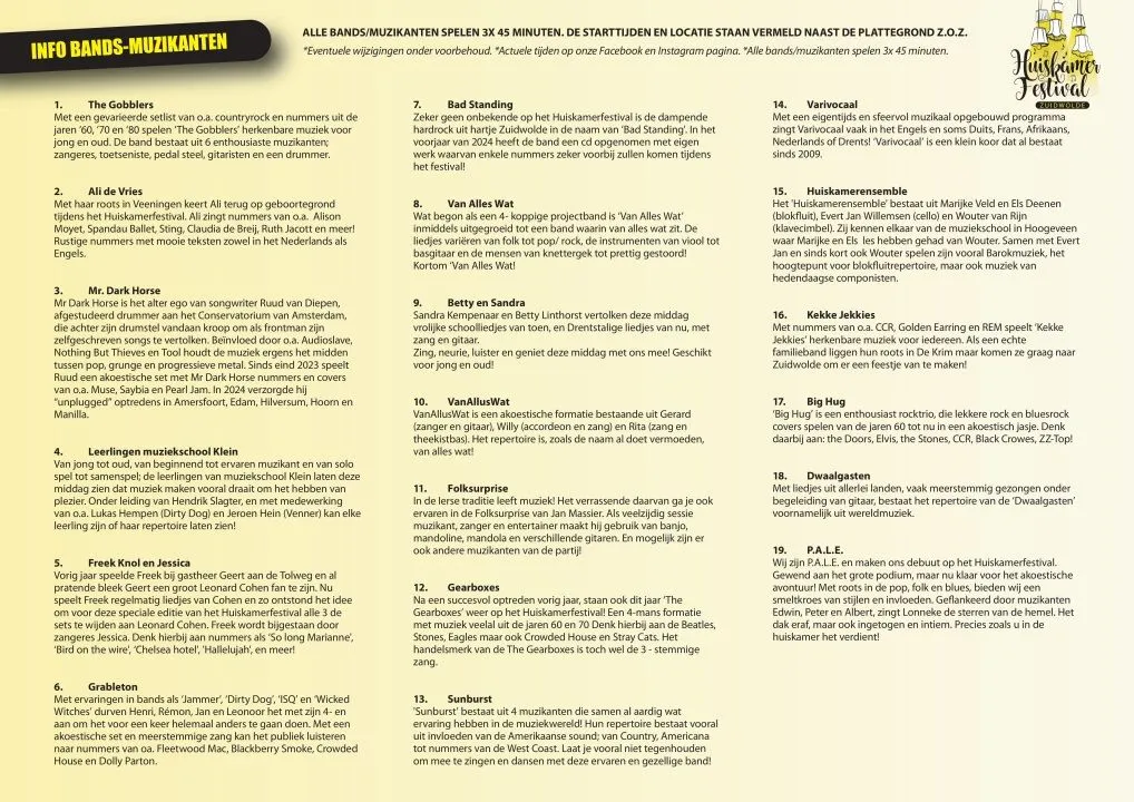 Wie al nieuwsgierig is geworden wie, waar en hoe laat speelt, kan een kijkje nemen op de website van het festival www.huiskamerfestivalzuidwolde.nl en de plattegrond downloaden om een eigen muzikale route te maken. Ook zijn er gratis papieren plattegronden beschikbaar op verschillende locaties in Zuidwolde, waaronder Plus supermarkt, Hoorcentrum De Wolden en Bloem&So.