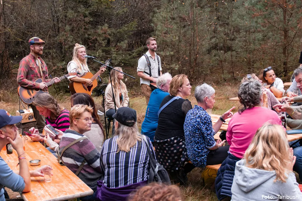 Na afloop van de wandeltochten lopen deelnemers direct het terrein van Taribush Kamp de Marke op. Daar start zaterdagmiddag een kleinschalig festival met live muziek, eten en ontmoeting in de buitenlucht. Het avondprogramma duurt tot circa 22.00 uur en is ook los te bezoeken.